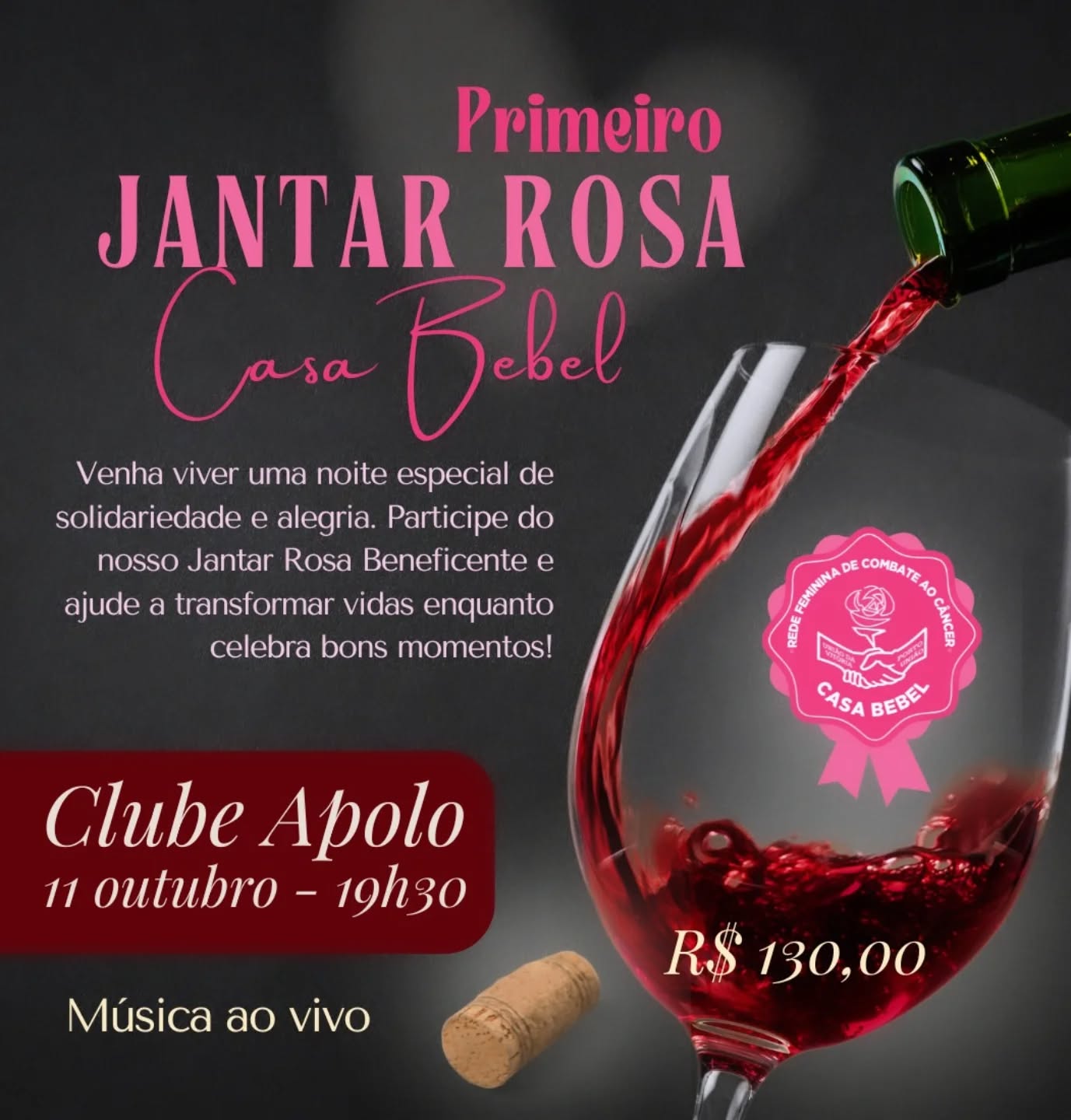 No dia 11 de outubro de 2025, às 19h30, o Clube Apolo, em União da Vitória, será palco do 1º Jantar Rosa – Casa Bebel, promovido pela Rede Feminina de Combate ao Câncer em apoio ao Outubro Rosa. O evento tem como objetivo conscientizar a população sobre a prevenção do câncer de mama e arrecadar recursos para a causa.