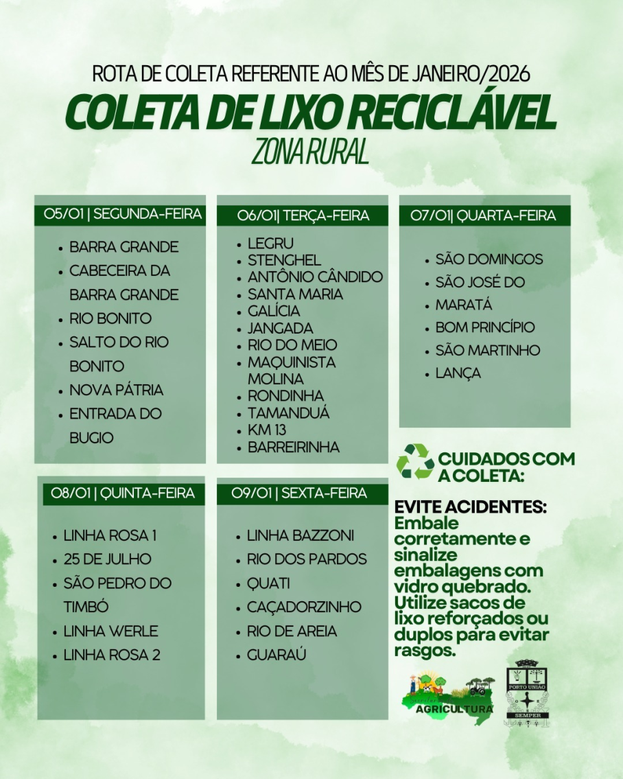 A coleta será realizada na primeira semana de janeiro, atendendo as comunidades conforme o calendário estabelecido, reforçando o compromisso com o meio ambiente, a limpeza rural e a sustentabilidade.