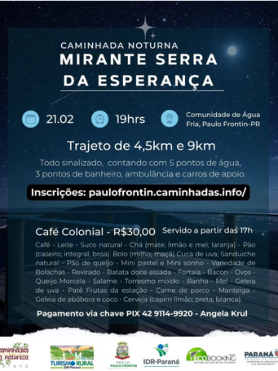 Uma proposta diferente para quem busca contato com a natureza e momentos de tranquilidade acontece no próximo dia 21 de fevereiro, em Paulo Frontin. A Caminhada Noturna no Mirante Serra da Esperança convida participantes a vivenciarem uma experiência especial sob o céu estrelado, em meio às belezas naturais da região.