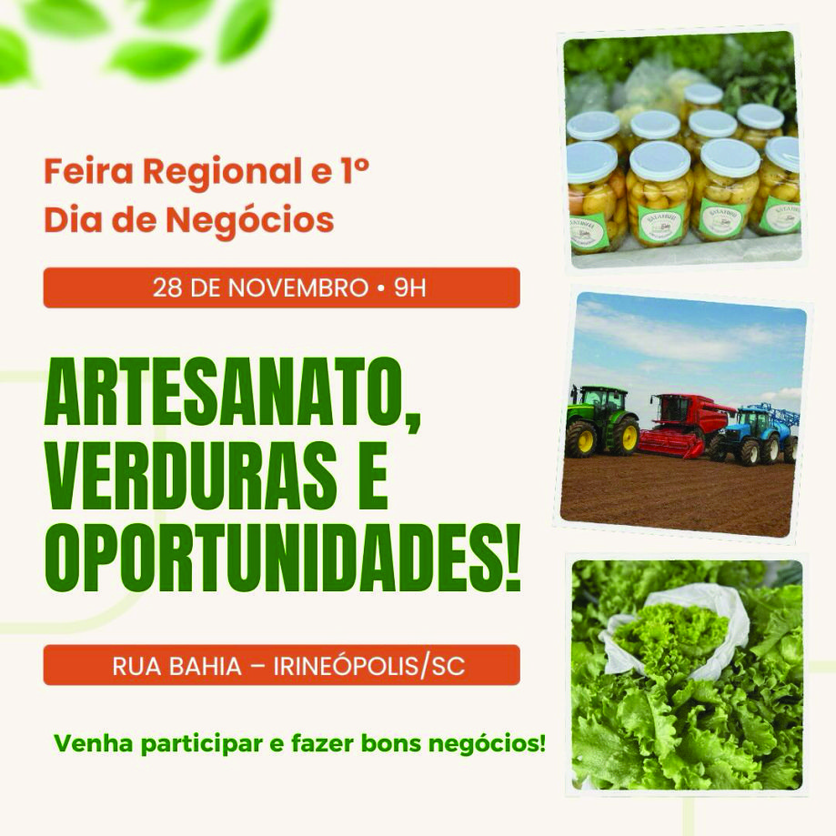 A Prefeitura de Irineópolis, em parceria com a Amplanorte e o Sebrae, realiza nesta sexta-feira, 28 de novembro, a Feira Regional de Produtos Artesanais e