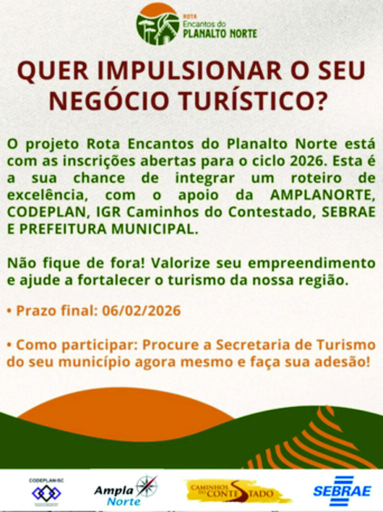 Empreendedores do setor turístico já podem se inscrever para o ciclo 2026 do Projeto Rota Encantos do Planalto Norte, iniciativa que busca fortalecer negócios locais