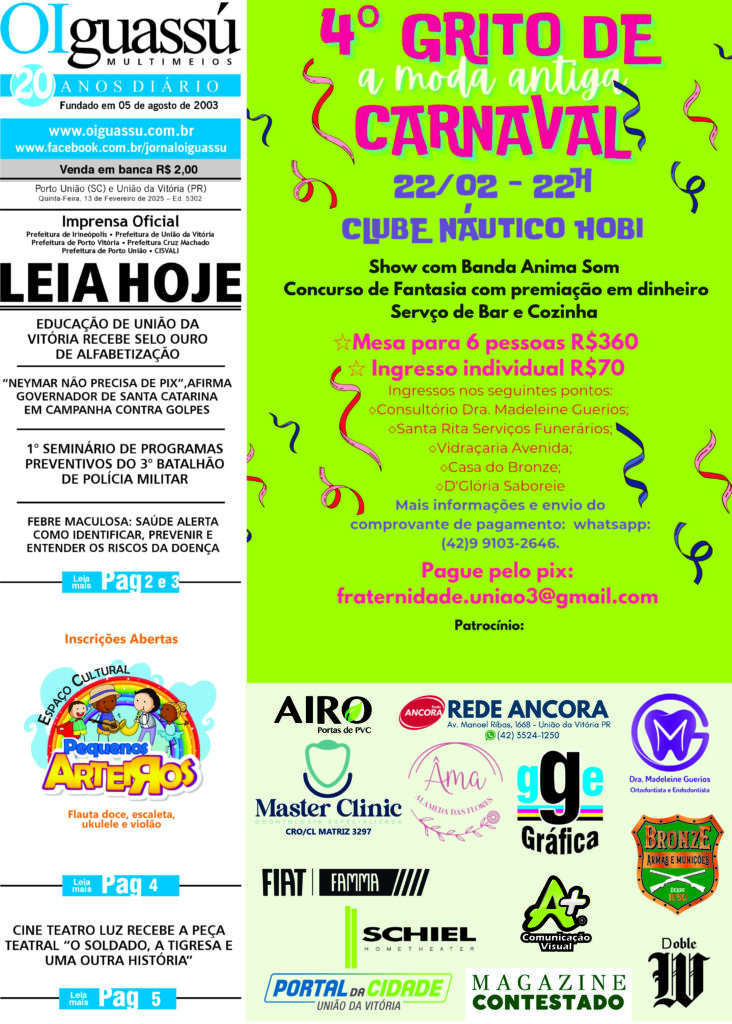 Ed 5301- 2024-02-12- Qua 13 de fevereiro de 2025 Edições Impressas 1 min read Ed 5301- 2024-02-12- Qua FacebookShare on XLinkedInWhatsAppEmailCopy Link Deixe um comentário Cancelar respostaYour email address will not be published. Δ FacebookPublicidade Horóscopo PublicidadeÚltimos Posts Anvisa aprova Mounjaro para criança e adolescente com diabetes tipo 2 23 de abril de 2026 MEC Livros: biblioteca digital já tem mais de meio milhão de usuários 23 de abril de 2026 ALUGUEL POR TEMPORADA EXIGE ATENÇÃO REDOBRADA NA HORA DE DECLARAR O IMPOSTO DE RENDA 23 de abril de 2026 NOVAS REGRAS DO MINHA CASA, MINHA VIDA 23 de abril de 2026 Publicidade Tags# #acidente #ADR #Bituruna #Canoinhas #ClaudioGugelmin #Coluna #CruzMachado #Economia #Educação #Esporte #Futebol #GeneralCarneiro #investimentos #irineopolis #ManchetesDia #Paraná #PM #Policial #PolíciaMilitar #portouniao #PrefeituraMunicipaldeUniãodaVitória #primeiroplano #PrincipaisJornaisPaís #SantaCatarina #saúde #SC #Segurança #Uniguacu #uniãodavitória (OP) Coronavírus COVID-19 Educação Investimento Irineópolis Obras Paraná PortoUnião SantaCatarina Saúde SuldoParaná UniãodaVitória Vacina Vacinação Publicação anterior Ed 5300- 2024-02-10 e 11 – Seg e Ter Próxima publicação Ed 5302- 2024-02-13- Qui Última publicação de Edições Impressas Ed 5582- 2026-04-20 a 23- Seg a Qui Ed 5582- 2026-04-20 a 23- Seg a Qui Facebook Share on X LinkedIn WhatsApp Email Copy Link Ed 5581- 2026-04-18 e 19- Sab e Dom Ed 5581- 2026-04-18 e 19- Sab e Dom Facebook Share on X LinkedIn WhatsApp Email Copy Link Ed 5579- 2026-04-16- Qui Ed 5579- 2026-04-16- Qui Facebook Share on X LinkedIn WhatsApp Email Copy Link Ed 5580- 2026-04-17- Sex Ed 5580- 2026-04-17- Sex Facebook Share on X LinkedIn WhatsApp Email Copy Link Ed 5578- 2026-04-15- Qua Ed 5578- 2026-04-15- Qua Facebook Share on X LinkedIn WhatsApp Email Copy Link