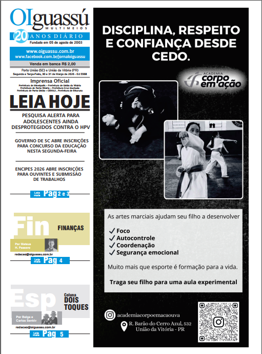 Ed 5569- 2026-04-01- Qua 6 de abril de 2026 Edições Impressas 1 min read Ed 5569- 2026-04-01- Qua FacebookShare on XLinkedInWhatsAppEmailCopy Link Deixe um comentário Cancelar respostaYour email address will not be published. Δ FacebookPublicidade Horóscopo PublicidadeÚltimos Posts Anvisa aprova Mounjaro para criança e adolescente com diabetes tipo 2 23 de abril de 2026 MEC Livros: biblioteca digital já tem mais de meio milhão de usuários 23 de abril de 2026 ALUGUEL POR TEMPORADA EXIGE ATENÇÃO REDOBRADA NA HORA DE DECLARAR O IMPOSTO DE RENDA 23 de abril de 2026 NOVAS REGRAS DO MINHA CASA, MINHA VIDA 23 de abril de 2026 Publicidade Tags# #acidente #ADR #Bituruna #Canoinhas #ClaudioGugelmin #Coluna #CruzMachado #Economia #Educação #Esporte #Futebol #GeneralCarneiro #investimentos #irineopolis #ManchetesDia #Paraná #PM #Policial #PolíciaMilitar #portouniao #PrefeituraMunicipaldeUniãodaVitória #primeiroplano #PrincipaisJornaisPaís #SantaCatarina #saúde #SC #Segurança #Uniguacu #uniãodavitória (OP) Coronavírus COVID-19 Educação Investimento Irineópolis Obras Paraná PortoUnião SantaCatarina Saúde SuldoParaná UniãodaVitória Vacina Vacinação Publicação anterior Ed 5568- 2026-03-30 e 31 – Seg e Terça Próxima publicação Ed 5570- 2026-04-02- Qui Última publicação de Edições Impressas Ed 5582- 2026-04-20 a 23- Seg a Qui Ed 5582- 2026-04-20 a 23- Seg a Qui Facebook Share on X LinkedIn WhatsApp Email Copy Link Ed 5581- 2026-04-18 e 19- Sab e Dom Ed 5581- 2026-04-18 e 19- Sab e Dom Facebook Share on X LinkedIn WhatsApp Email Copy Link Ed 5579- 2026-04-16- Qui Ed 5579- 2026-04-16- Qui Facebook Share on X LinkedIn WhatsApp Email Copy Link Ed 5580- 2026-04-17- Sex Ed 5580- 2026-04-17- Sex Facebook Share on X LinkedIn WhatsApp Email Copy Link Ed 5578- 2026-04-15- Qua Ed 5578- 2026-04-15- Qua Facebook Share on X LinkedIn WhatsApp Email Copy Link