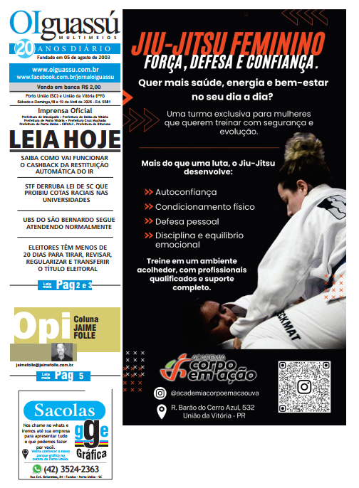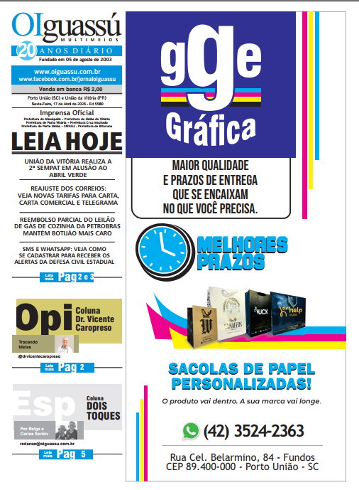 Ed 5574- 2026-04-09- Qui 14 de abril de 2026 Edições Impressas 1 min read Ed 5574- 2026-04-09- Qui FacebookShare on XLinkedInWhatsAppEmailCopy Link Deixe um comentário Cancelar respostaYour email address will not be published. Δ FacebookPublicidade Horóscopo PublicidadeÚltimos Posts HOSPEDAGENS COMEÇARAM A ADOTAR CHECK-IN DIGITAL 23 de abril de 2026 Mega-Sena sorteia nesta quinta-feira prêmio acumulado em R$ 70 milhões 23 de abril de 2026 O Brasileiro é Treinado para Ser Pobre 23 de abril de 2026 Panorama de Mercado 23 de abril de 2026 Publicidade Tags# #acidente #ADR #Bituruna #Canoinhas #ClaudioGugelmin #Coluna #CruzMachado #Economia #Educação #Esporte #Futebol #GeneralCarneiro #investimentos #irineopolis #ManchetesDia #Paraná #PM #Policial #PolíciaMilitar #portouniao #PrefeituraMunicipaldeUniãodaVitória #primeiroplano #PrincipaisJornaisPaís #SantaCatarina #saúde #SC #Segurança #Uniguacu #uniãodavitória (OP) Coronavírus COVID-19 Educação Investimento Irineópolis Obras Paraná PortoUnião SantaCatarina Saúde SuldoParaná UniãodaVitória Vacina Vacinação Publicação anterior Ed 5573- 2026-04-08- Qua Próxima publicação ed 5575 – 2026-04-10 – Sex Última publicação de Edições Impressas Ed 5582- 2026-04-20 a 23- Seg a Qui Ed 5582- 2026-04-20 a 23- Seg a Qui Facebook Share on X LinkedIn WhatsApp Email Copy Link Ed 5581- 2026-04-18 e 19- Sab e Dom Ed 5581- 2026-04-18 e 19- Sab e Dom Facebook Share on X LinkedIn WhatsApp Email Copy Link Ed 5579- 2026-04-16- Qui Ed 5579- 2026-04-16- Qui Facebook Share on X LinkedIn WhatsApp Email Copy Link Ed 5580- 2026-04-17- Sex Ed 5580- 2026-04-17- Sex Facebook Share on X LinkedIn WhatsApp Email Copy Link Ed 5578- 2026-04-15- Qua Ed 5578- 2026-04-15- Qua Facebook Share on X LinkedIn WhatsApp Email Copy Link