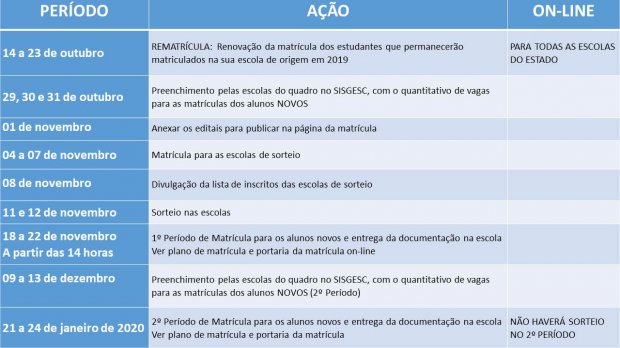 A Secretaria de Estado da Educação (SED) de Santa Catarina apresentou nesta quarta-feira, 9 de outubro, o Calendário Escolar para o ano letivo 2020. A grande novidade é que as matrículas serão feitas de forma online em todo o estado. Até então, a modalidade estava disponível apenas para as escolas estaduais da Grande Florianópolis. As rematrículas seguem sendo feitas pela internet.