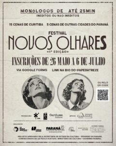 Primeira edição do festival paranaense Novos Olhares, vai selecionar 20 artistas para apresentação de “cena breve” no Teatro José Maria Santos, no mês de outubro, em Curitiba. O formulário de inscrição está disponível no link da Bio do @apdatreze até o dia sete (7) de julho de 2025.