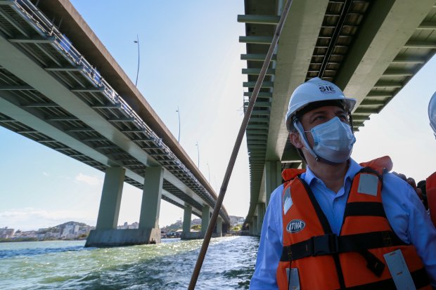 O governador Carlos Moisés e o secretário de Estado da Infraestrutura e Mobilidade, Thiago Vieira, realizaram nesta sexta-feira, 16, uma vistoria nas obras de recuperação das pontes Colombo Machado Salles e Pedro Ivo Campos, que fazem a ligação entre o continente e a Ilha de Santa Catarina, em Florianópolis. Atualmente, há dois contratos em andamento para restauração estrutural dos equipamentos, que somam um investimento de R$ 35,7 milhões, com recursos próprios.