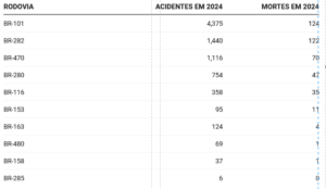 De acordo com dados divulgados recentemente pela Polícia Rodoviária Federal (PRF), a rodovia federal com o maior número de mortes em acidentes em Santa Catarina é a BR-101. Foram 124 vítimas fatais em 4.375 acidentes registrados ao longo do ano de 2024.