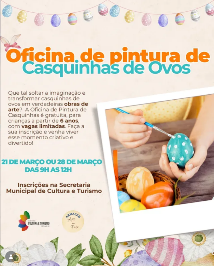 A Secretaria Municipal de Cultura e Turismo está com inscrições abertas para a Oficina de Pintura de Casquinhas de Ovos, atividade gratuita voltada a crianças a partir de 6 anos. A proposta é estimular a criatividade e proporcionar um momento de lazer e aprendizado por meio da arte.