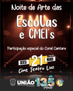Dando sequência a programação, na sexta-feira, 21, acontecerá a “Noite de Arte” com exposição e apresentações dos alunos da rede municipal de ensino, no Cine Teatro Luz. “Esse será um momento especial com 15 apresentações dos nossos alunos e que mostram todo o empenho e dedicação dos professores, equipe e alunos para a comemoração do aniversário de União da Vitória”, destacou a secretária de educação, Solange Garcia.
