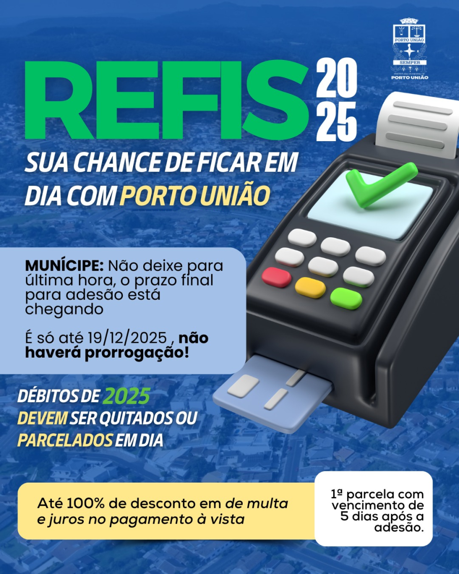 O REFIS 2025 é a oportunidade para você regularizar seus débitos com a Prefeitura de Porto União e garantir vantagens exclusivas oferecidas.