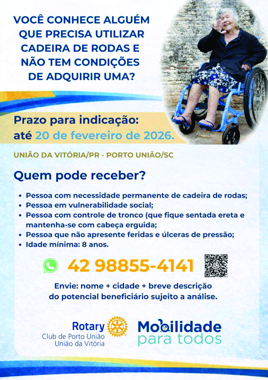 O Rotary Club de Porto União iniciou a captação de indicações de pessoas que necessitam de cadeira de rodas, com o objetivo de ampliar o atendimento a pessoas em situação de vulnerabilidade social no município e região. A ação faz parte de um projeto social desenvolvido pelo clube, que busca garantir mais mobilidade, autonomia e qualidade de vida a quem possui necessidade permanente do equipamento.