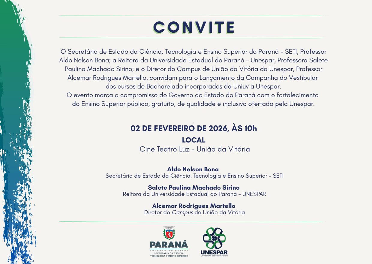A Universidade Estadual do Paraná (Unespar) realiza no dia 2 de fevereiro de 2026 o lançamento oficial da campanha do vestibular dos cursos de Bacharelado incorporados da antiga Uniuv à estrutura da universidade estadual. O evento ocorrerá às 10h, no Cine Teatro Luz, em União da Vitória.