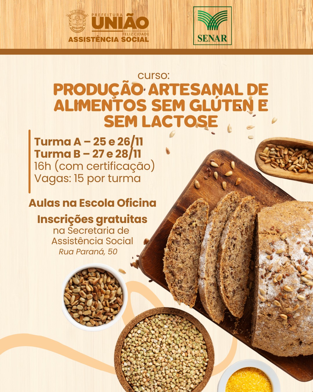 A Secretaria Municipal de Assistência Social de União da Vitória, em parceria com o Serviço Nacional de Aprendizagem Rural (Senar), está com inscrições abertas para o curso “Produção artesanal de alimentos – produtos sem glúten e sem lactose”. A capacitação é gratuita e voltada a pessoas interessadas em aprender receitas saborosas e acessíveis para o público com restrições alimentares.
