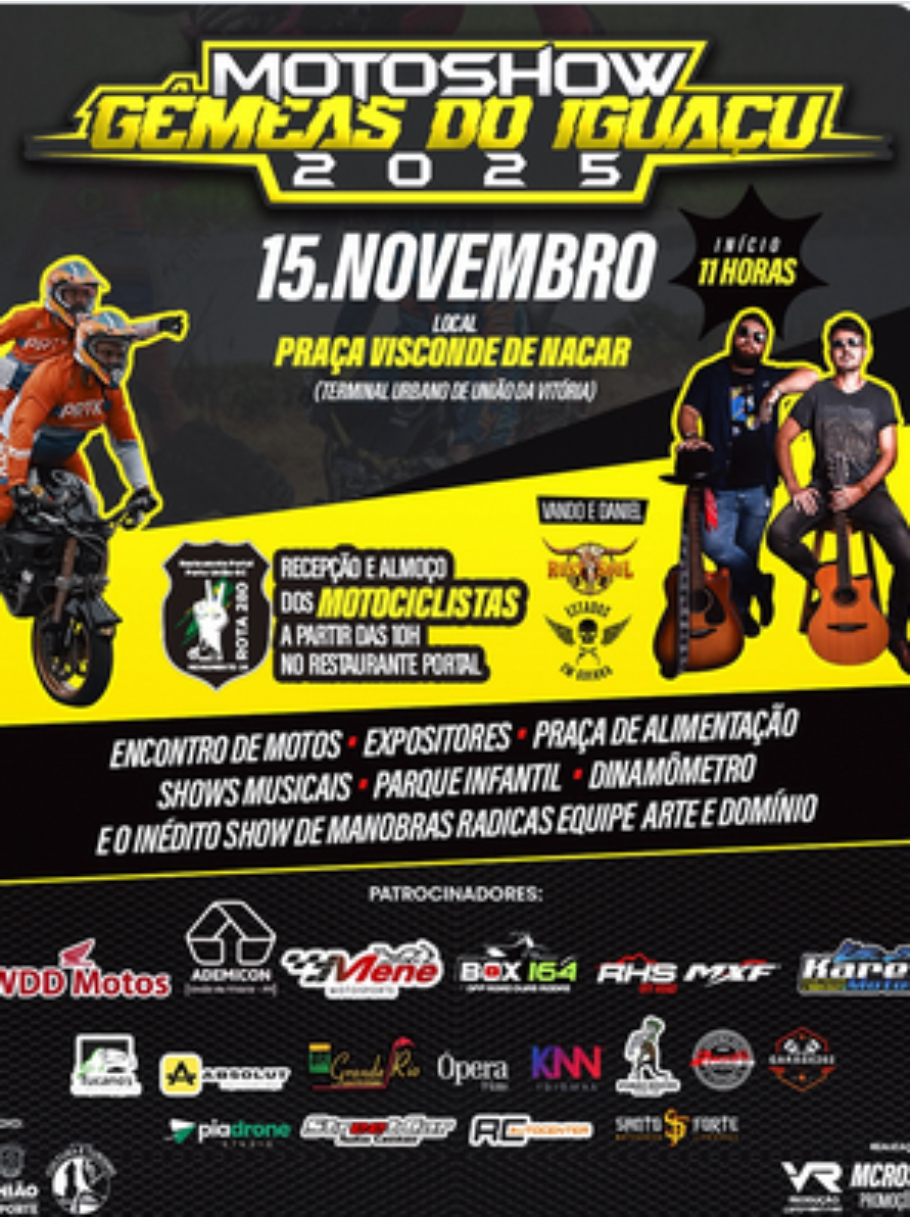 União da Vitória se prepara para viver um feriado de muita adrenalina e diversão! No dia 15 de novembro, a cidade será palco do 1º Motos Show Gêmeas do Iguaçu, evento que promete reunir apaixonados por motociclismo e famílias em um grande encontro na Praça Visconde de Nácar, no Terminal Urbano.